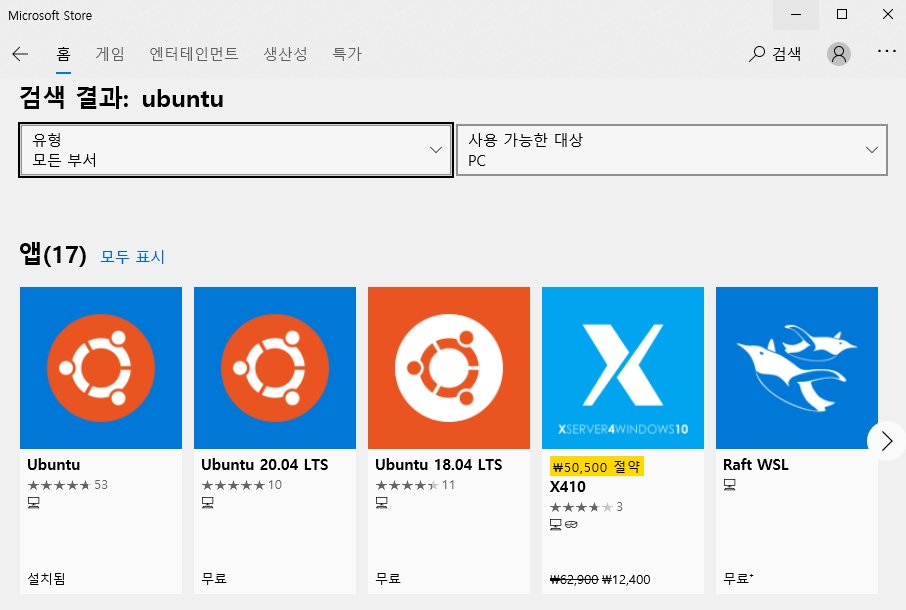 -> Microsoft Store, Ubuntu 설치