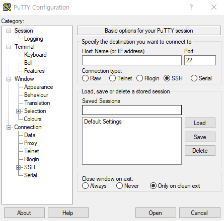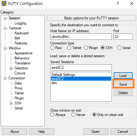 -> PuTTy 다시 저장 후 Open