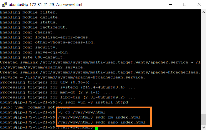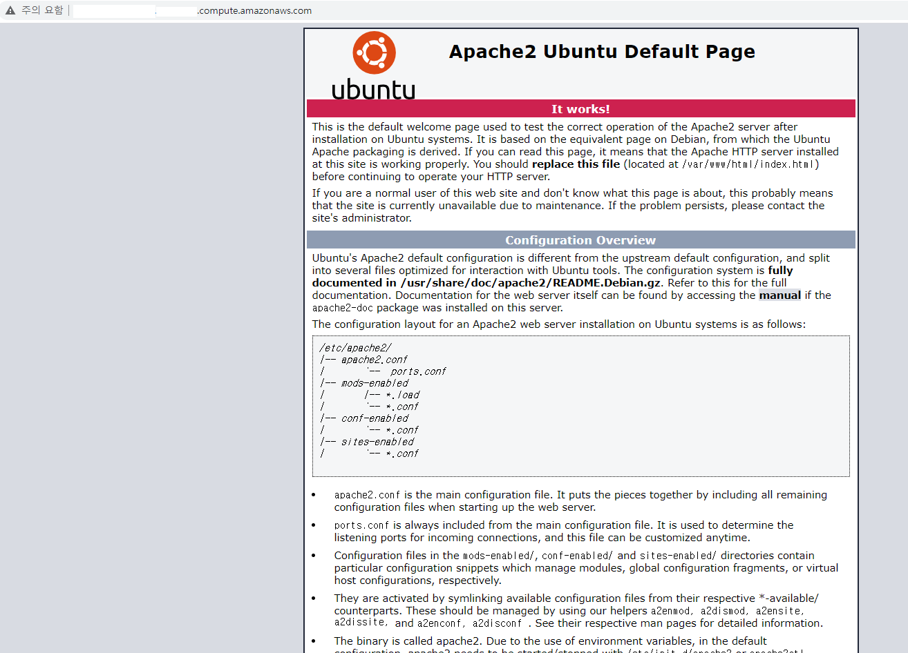 -> 웹 서버 구동을 위한 apache2 설정 & 아파치 설치가 제대로 되었는지 확인
