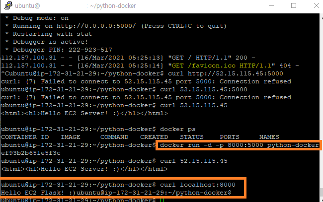 -> 서버 연결이 거부되어 명령이 실패했다. 호스트의 포트를 5000에 매핑 해야 한다.